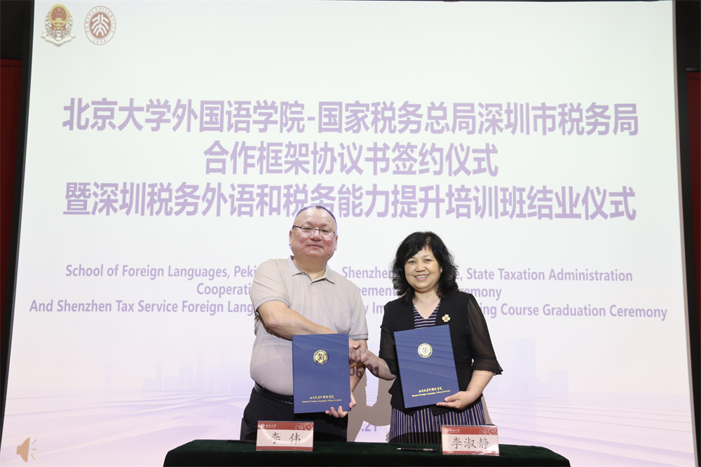 6月21日下午,“欧美大片ppt免费大全外国语学院-深圳税务局合作框架协议书签约仪式暨深圳税务外语和税务能力提升培训班结业仪式”在外国语学院新楼501举行。国家税务总局深圳市税务局党委委员、副局长李伟,国家税务总局深圳市税务局党委委员、总会计师杨庆,国家税务总局深圳市税务局人事处副处长沈思,欧美大片ppt免费大全外国语学院党委书记李淑静、欧美大片ppt免费大全外国语学院副院长王恒出席签约仪式。李淑静书记与李伟副局长共同签署了《国际化人才培养合作框架协议书》,就双方在国际化人才培养、教学与实习实践、培训与科研合作、党建共建等方面达成合作意向。